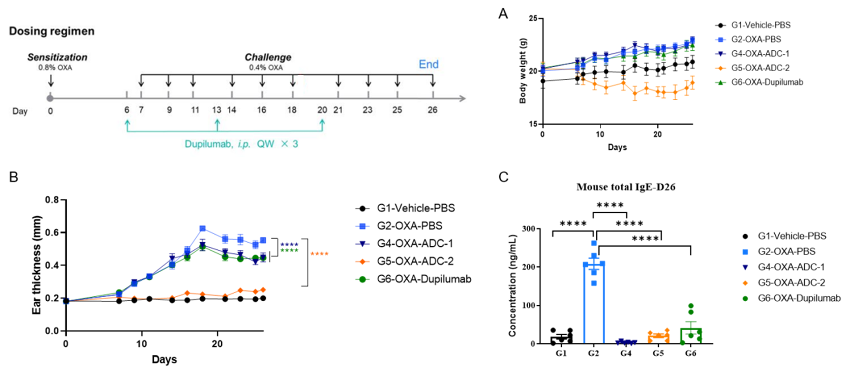 抗人IL4RA抗体及ADC药物在B-hIL4/hIL4RA小鼠中的药效评估。 各组小鼠经腹腔注射给予抗hIL4RA抗体和ADC药物(药物由客户提供,每组n=6)。 (A) 治疗期间的体重变化。 (B) 各组耳部厚度的统计分析。 (C) 血清中总IgE水平。结果显示,与未治疗组(G2,模型组)相比,接受抗IL4RA抗体和ADC药物治疗的小鼠组耳部厚度显著降低。 在实验终点采集血清,并通过ELISA分析IgE水平。结果显示,接受抗人IL4RA抗体和ADC药物治疗的小鼠,其总IgE水平和耳厚明显低于未治疗组小鼠。 数值以Mean±SEM表示。显著性通过双因素方差分析(two-way ANOVA)确定。 *P < 0.05, **P <0.01, ***P < 0.001, ****P < 0.0001。(客户合作数据)