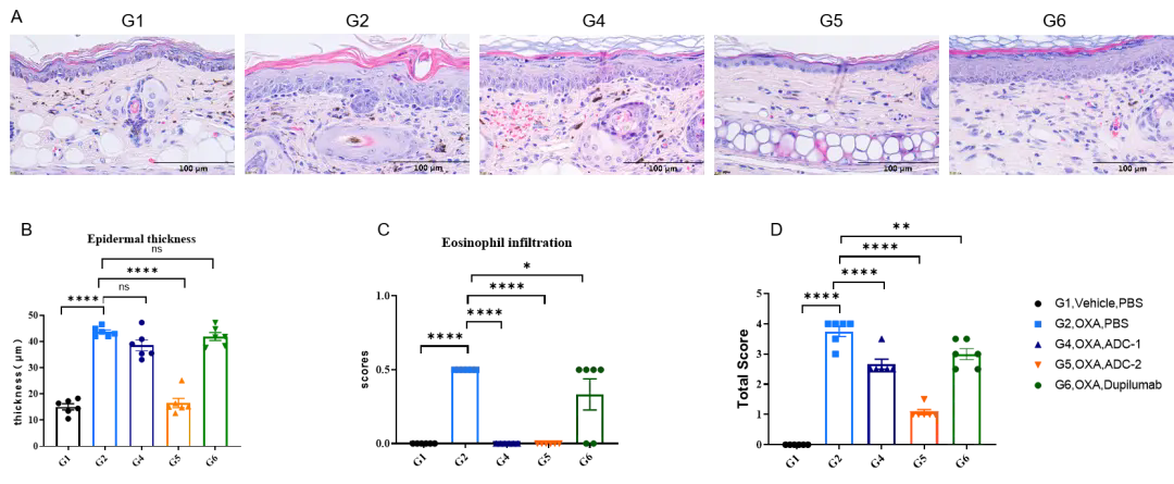 耳部病理评分及表皮厚度。在实验终点采集耳部组织并进行H&E染色分析。结果显示,与未治疗组(G2)相比,接受ADC药物(由客户提供)治疗的小鼠组,其耳部皮肤表皮厚度和病理评分显著降低。数值以Mean±SEM表示。显著性通过双因素方差分析(two-way ANOVA)确定。 *P < 0.05, **P < 0.01, ***P < 0.001,****P < 0.0001(客户合作数据)
