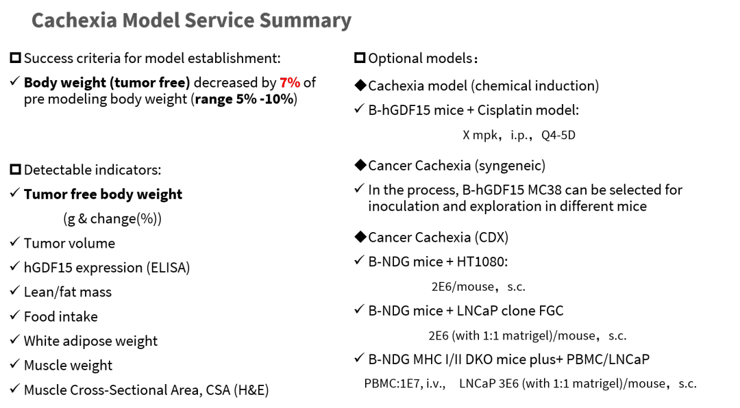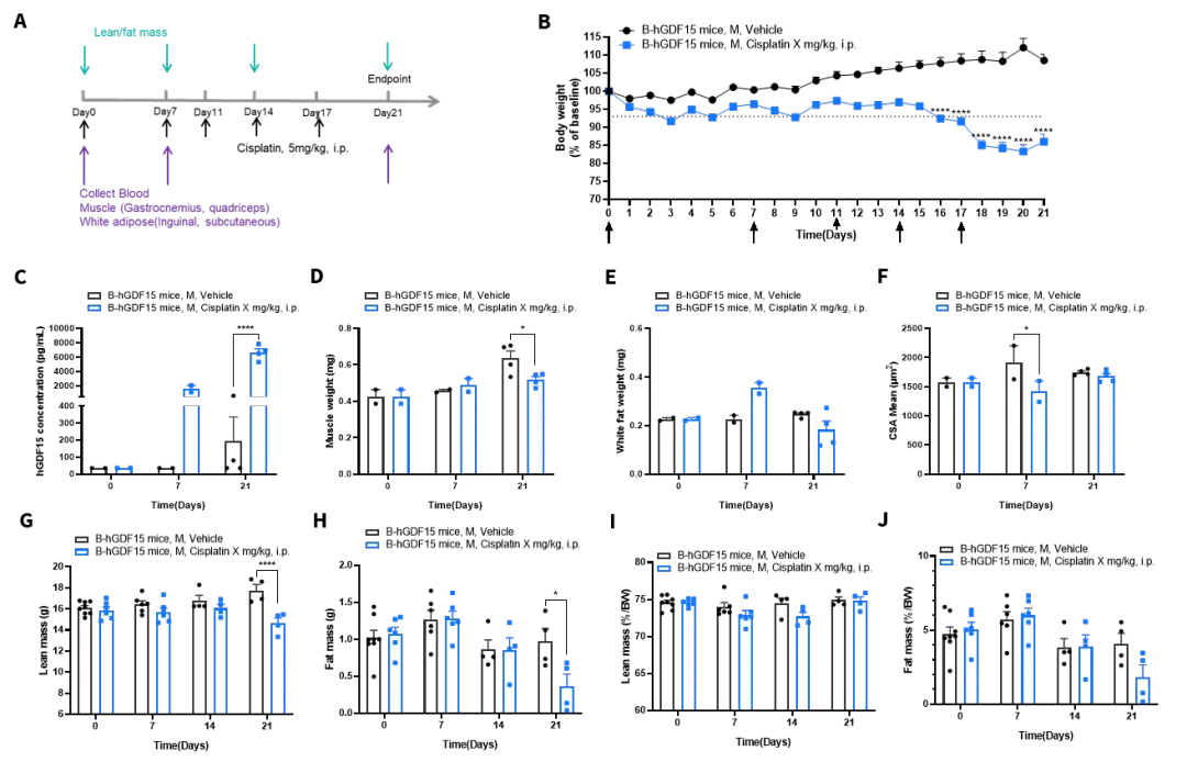综上,本研究通过 Cisplatin 高频给药在B-hGDF15小鼠中成功构建了伴有GDF15升高的恶病质模型,系统验证了其在体重、体成分、血液标志物、组织重量及病理形态等方面的典型消耗表型,为后续机制研究与药物评价提供了可靠的工具。