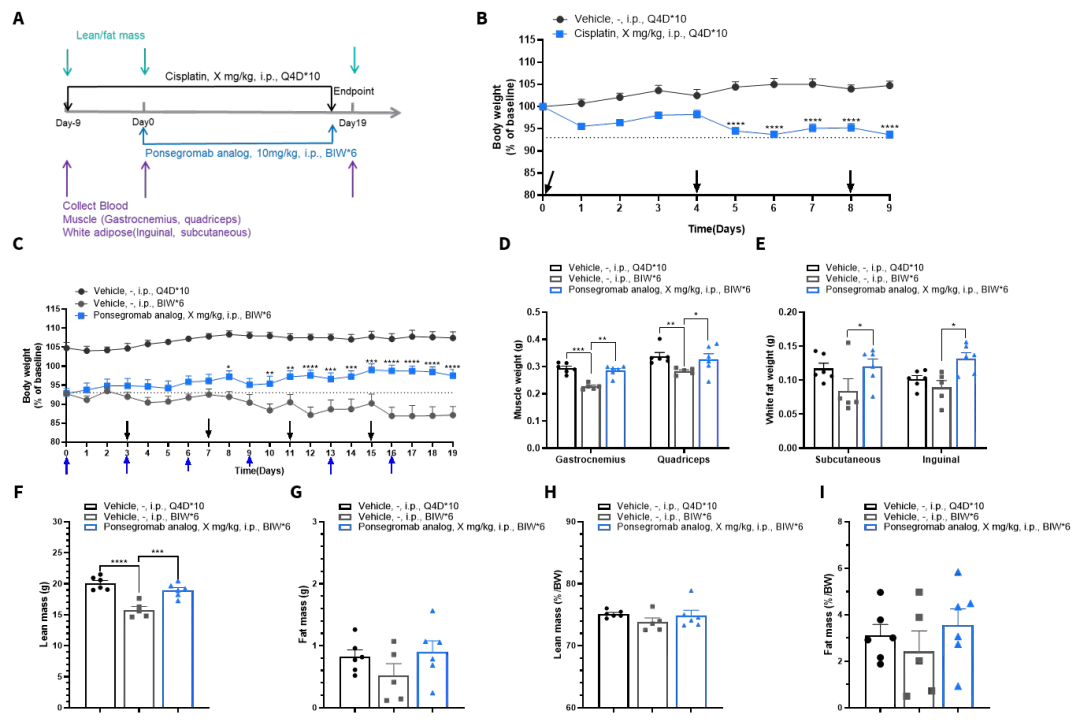 实验终点时,治疗组小鼠的Lean mass与Fat mass较对照组均有所回升,骨骼肌(腓肠肌、股四头肌)重量也增加,白色脂肪组织(腹股沟、皮下脂肪)重量也呈现恢复趋势,提示Ponsegromab在该Cisplatin诱导的恶病质模型中表现出改善体重丢失、维持体成分的药效潜力,为后续针对GDF15相关靶点的抗恶病质药物开发提供了临床前依据。