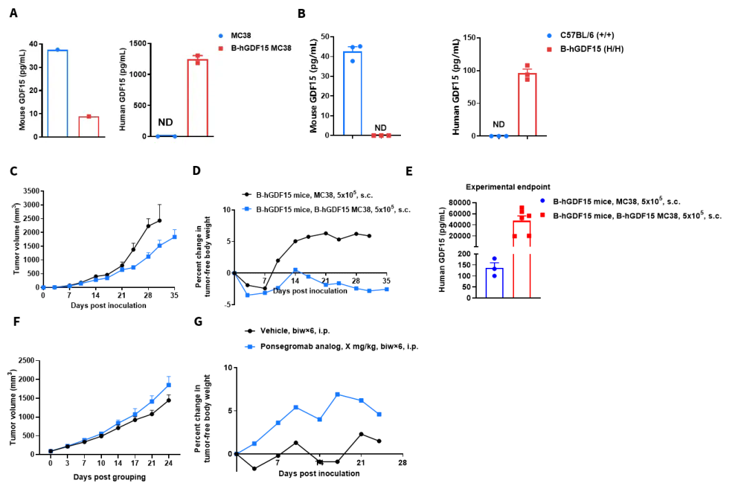 我们尝试模拟了GDF15驱动的恶病质进程:将B-hGDF15 MC38细胞接种于B-hGDF15小鼠后,肿瘤稳定生长(图6C),去瘤体重与对照组(野生MC38)相比显著下降(图6D,尽管未能检测到与自身初始体重比显著下降的体重(丢7%初始体重)),同时血清中hGDF15水平急剧升高(图6E)。治疗性干预结果显示,hGDF15靶向治疗并不会抑制肿瘤生长(图6F),但能显著逆转体重下降趋势(图6G),证明了该模型在药效评估中的实用价值。