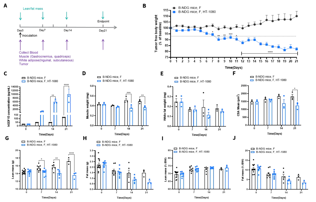 图7A显示成功构建了HT-1080人源纤维肉瘤的CDX模型,并对其诱导的癌症恶病质表型进行了系统评估,证实该模型可引发显著的宿主消耗。如图7B所示,在肿瘤生长期间,小鼠的去瘤体重显著下降,表明发生了全身性的代谢消耗。通过血液检测发现,小鼠血浆中的人源GDF15(hGDF15)浓度急剧上升(图7C),证实HT-1080肿瘤持续分泌这一关键的恶病质驱动因子。骨骼肌重量(腓肠肌、股四头肌)显著减轻(图7D),白色脂肪组织(腹股沟、皮下)重量也明显减少(图7E),且骨骼肌的H&E染色切片显示,小鼠的肌纤维横截面积显著减小(图7F),从形态学上直接证实了肌肉萎缩的发生。模型小鼠的瘦体质量(Lean Mass)也显著下降(图7G)。