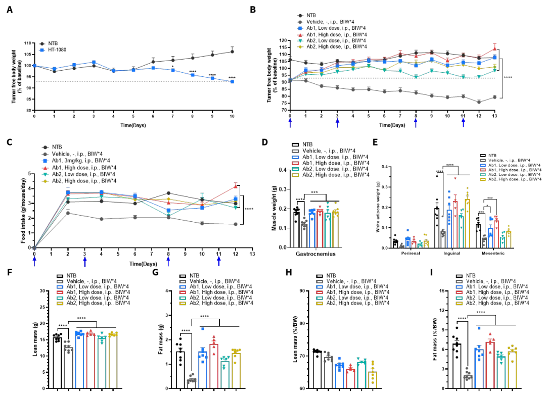 在成功建立 HT-1080诱导的恶病质模型后,,我们进一步开展了药效研究(图8)。小鼠在体重显著下降后(图8A,造模至分组前数据),被随机分为四个治疗组与对照组(保留未接种肿瘤细胞的小鼠为空白对照组),并接受为期两周的干预。