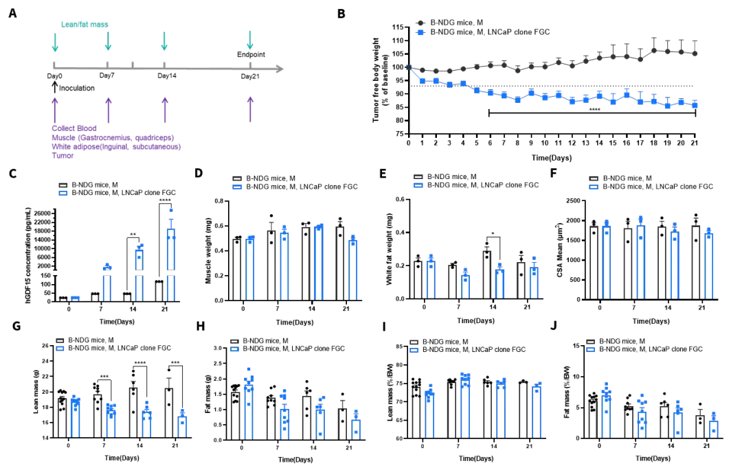 此外,我们也成功构建了LNCaP人前列腺癌的CDX模型,并对其诱导的癌症恶病质表型进行了系统评估,成功诱导了显著的宿主消耗。如图9B所示,在肿瘤生长期间,小鼠的去瘤体重显著下降,表明发生了全身性的体重丢失。通过血液检测发现,小鼠血浆中的人源GDF15(hGDF15)浓度急剧上升(图9C),证实LNCaP肿瘤持续分泌这一关键的恶病质驱动因子。骨骼肌重量(腓肠肌、股四头肌)减轻(图9D),白色脂肪组织(腹股沟、皮下脂肪)重量也显著减少(图9E),且骨骼肌的H&E染色切片显示,小鼠的肌纤维横截面积也呈现减小趋势(图9F)。小鼠的瘦体质量(Lean Mass)显著下降(图9G)。