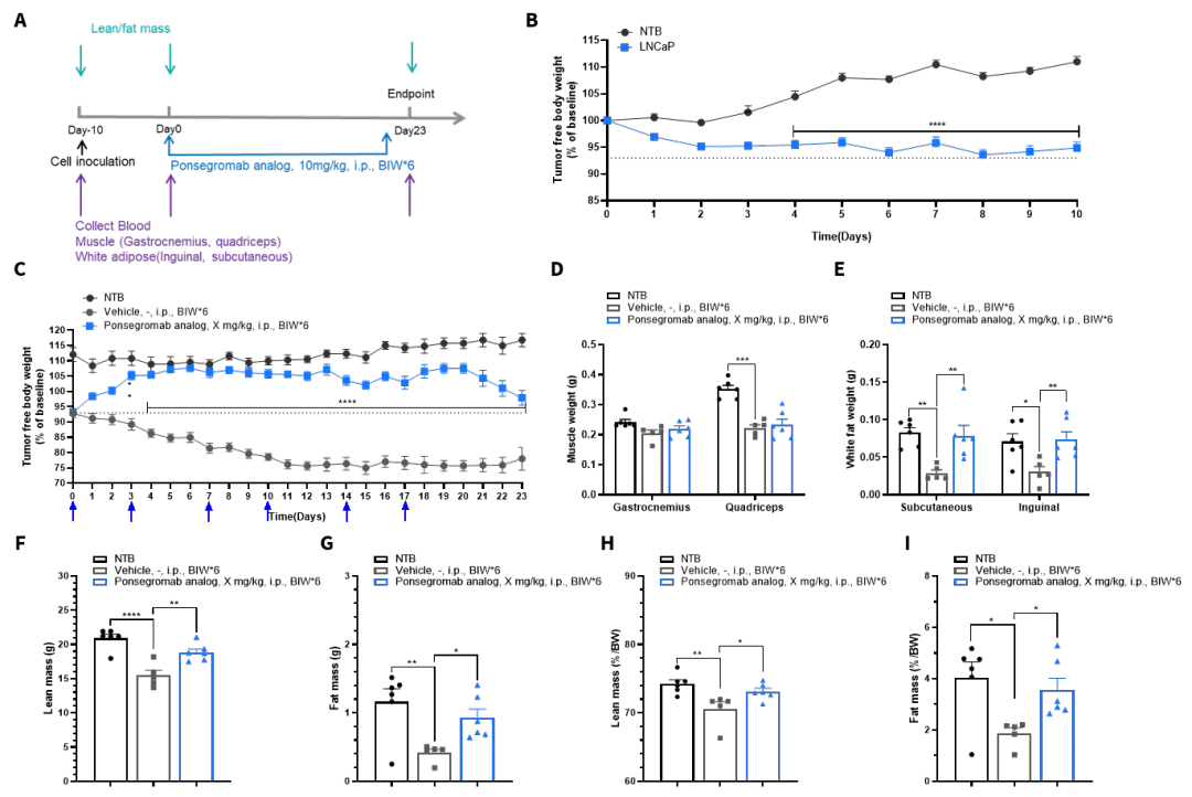 同样在成功建立 LNCaP诱导的恶病质模型后,我们进一步开展了药效研究(图10)。小鼠在体重显著下降后(图10B,造模至分组前数据),被随机分为治疗组与对照组(保留未接种肿瘤细胞的小鼠为空白对照组),并接受为期两周的干预。