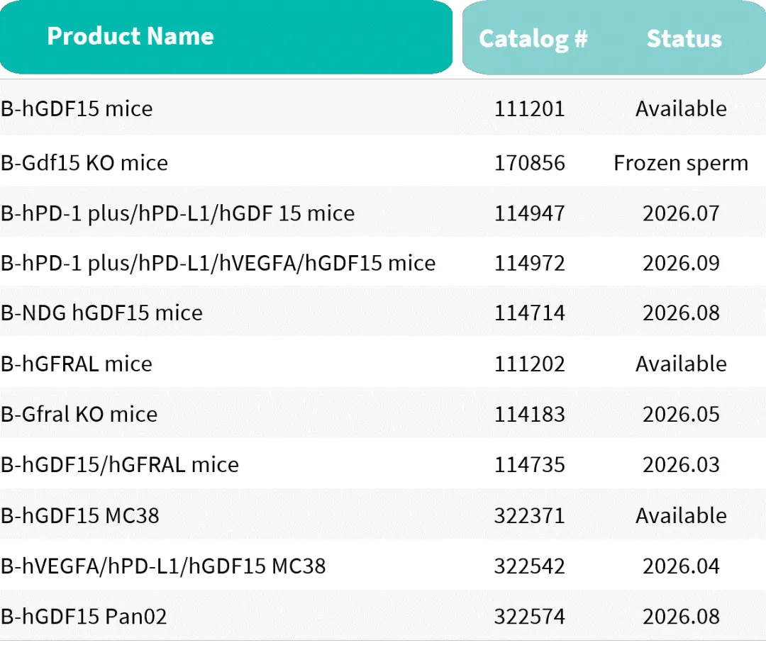 到目前为止,围绕hGDF15靶点的完整临床前研究产品体系(图6H)已成功建立,涵盖从基因人源化细胞、人源化动物模型到相应的表型检测,旨在为学术界与工业界提供一站式的解决方案,共同推进恶病质新药的开发。