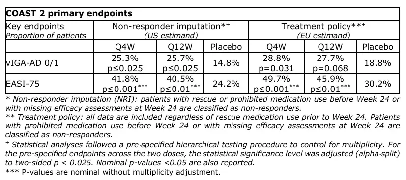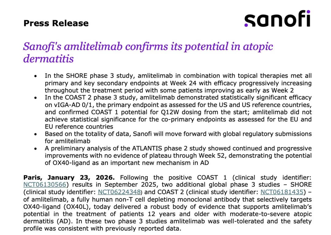 2026年1月23日,赛诺菲宣布Amlitelimab在特应性皮炎III期SHORE与COAST 2研究中达到主要终点。此前,COAST 1已在2025年率先读出积极结果。赛诺菲官方披露,SHORE研究中,Amlitelimab联合局部治疗在第24周达到主要及关键次要终点,且部分患者在第2周已出现改善。