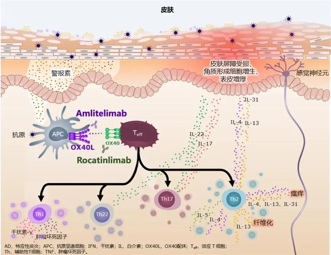 从疾病机制看,OX40/OX40L位于多类炎症反应的上游节点。相关综述文献指出,该轴可影响Th1、Th2、Th17、Th22等多种辅助性T细胞通路,因此其抑制作用并不局限于单一炎症因子,而可能带来更广谱的免疫调节效果。[2][3]