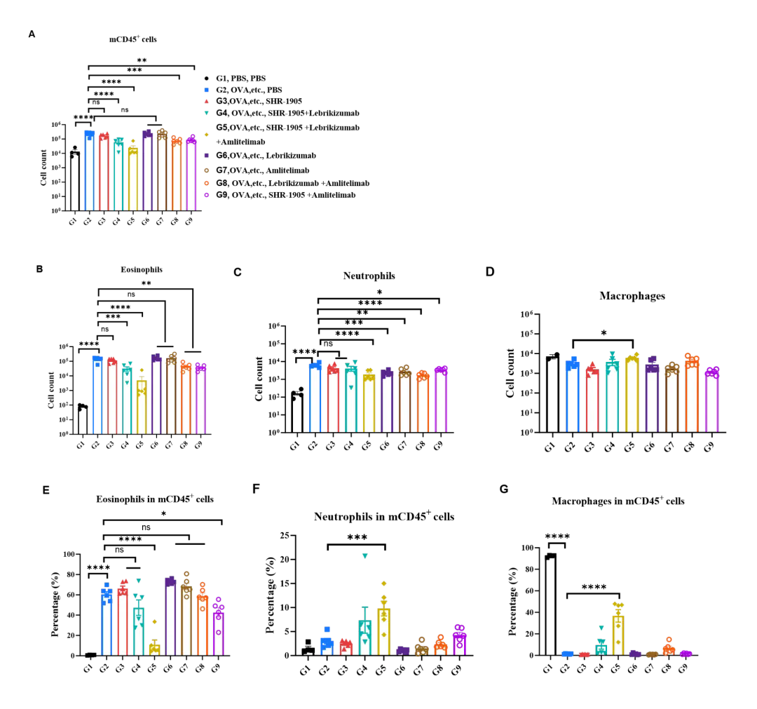 BALF中免疫细胞分析。B-hTSLP/hTSLPR plus/hOX40/hOX40L小鼠(雌性,7周龄,n=6)经OVA等诱导剂免疫以诱导哮喘。向B-hTSLP/hTSLPR plus/hOX40/hOX40L小鼠腹腔注射抗人TSLP抗体(SHR-1905类似物,由客户提供)、抗OX40L抗体(Amlitelimab类似物,由客户提供)及抗人IL13抗体(Lebrikizumab类似物,由客户提供)。(A&B) 抗人IL13抗体组、抗人TSLP抗体联合抗人IL13抗体治疗组、抗人IL13抗体联合抗人OX40L抗体治疗组以及抗人OX40L抗体联合抗人IL13抗体或抗人TSLP抗体治疗组中,支气管肺泡灌洗液(BALF)中CD45+细胞与嗜酸性粒细胞的数量。抗人OX40L抗体联合抗人IL13抗体治疗组,以及抗人OX40L抗体联合抗人IL13抗体或抗人TSLP抗体治疗组中,与PBS对照组相比显著降低。数据以均值±标准误表示。显著性采用双因素方差分析检验确定。*P<0.05, **P<0.01, ****P<0.0001, ***P<0.001, ns,无统计学意义。