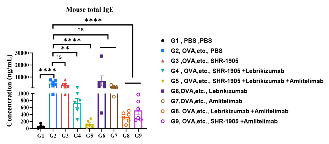 小鼠血清总IgE分析。B-hTSLP/hTSLPR plus/hOX40/hOX40L小鼠(雌性,7周龄,n=6)经OVA等诱导剂免疫以诱导哮喘。抗人TSLP抗体(SHR-1905类似物,由客户提供)、抗人OX40L抗体(Amlitelimab类似物,由客户提供)及抗人IL13抗体(Lebrikizumab类似物,由客户提供)腹腔注射至B-hTSLP/hTSLPR plus/hOX40/hOX40L小鼠体内。于研究终点采集血清,通过ELISA法检测IgE水平。结果显示,接受抗人IL13抗体治疗组、抗人TSLP抗体联合抗人IL13抗体及抗OX40L抗体联合治疗组、抗人OX40L抗体联合抗人IL13抗体或抗人TSLP抗体联合治疗组的小鼠,其总IgE水平较未治疗组显著降低。数据以均值±标准误表示。显著性检验采用双因素方差分析法。*P <0.05,**P <0.01,****P <0.0001,***P <0.001,ns表示无显著性差异。