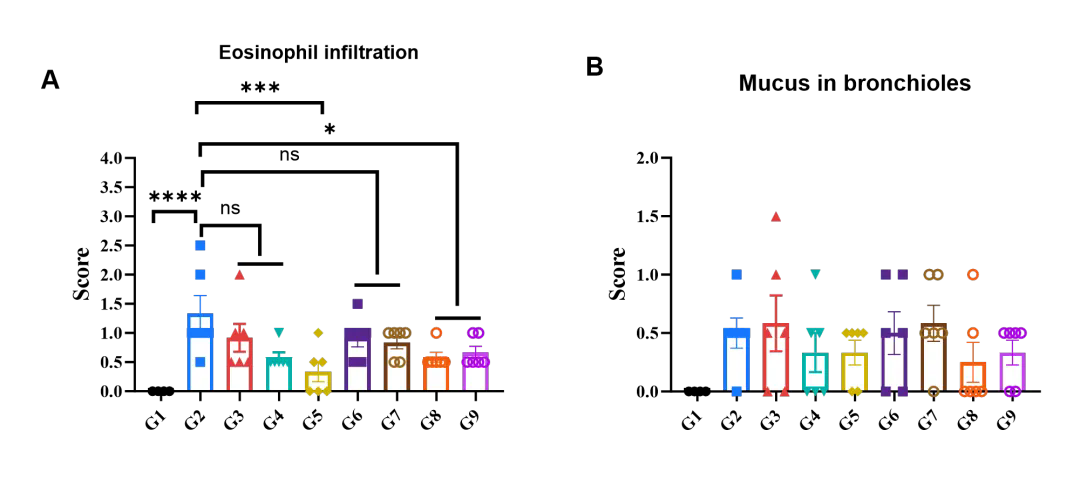 B-hTSLP/hTSLPR plus/hOX40/hOX40L小鼠哮喘样模型的H&E染色。在研究终点收集肺组织并进行H&E染色分析。结果显示:抗OX40L抗体联合抗人IL13抗体和抗人TSLP抗体可以明显优于单抗和两个单抗联用,三个单抗联用显著降低肺部组织中OVA等诱导的嗜酸粒细胞浸润以及炎性细胞浸润,表明B-hTSLP/hTSLPR plus/hOX40/hOX40L小鼠可作为评估抗人TSLP抗体和抗人OX40L抗体的强有力体内临床前模型。数据以均值±标准误表示。*P <0.05, **P< 0.01, ****P<0.0001, ***P<0.001,ns,无统计学意义。