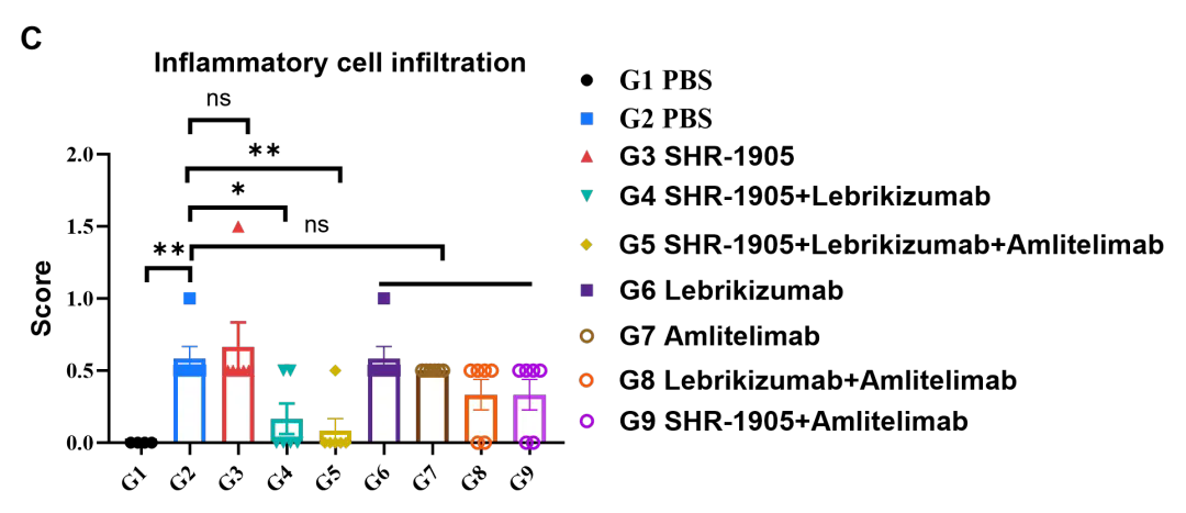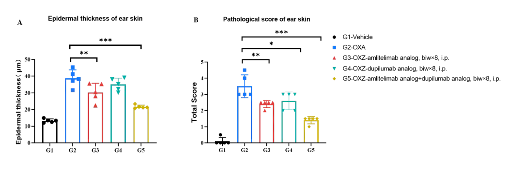 B-hIL4/hIL4RA/hIL13/hIL13RA1/hOX40/hOX40L小鼠AD模型的H&E染色。在研究终点收集耳组织并进行H&E染色分析。结果显示,与未处理组(G2)相比,接受Amlitelimab类似物或Dupilumab类似物治疗的小鼠组,其耳部皮肤表皮厚度及病理评分显著降低,单抗联用治疗效果优于单抗治疗。数据以均值±标准误表示。显著性采用双因素方差分析检验确定。*P<0.05, **P<0.01, ***P<0.001, ****P<0.0001。