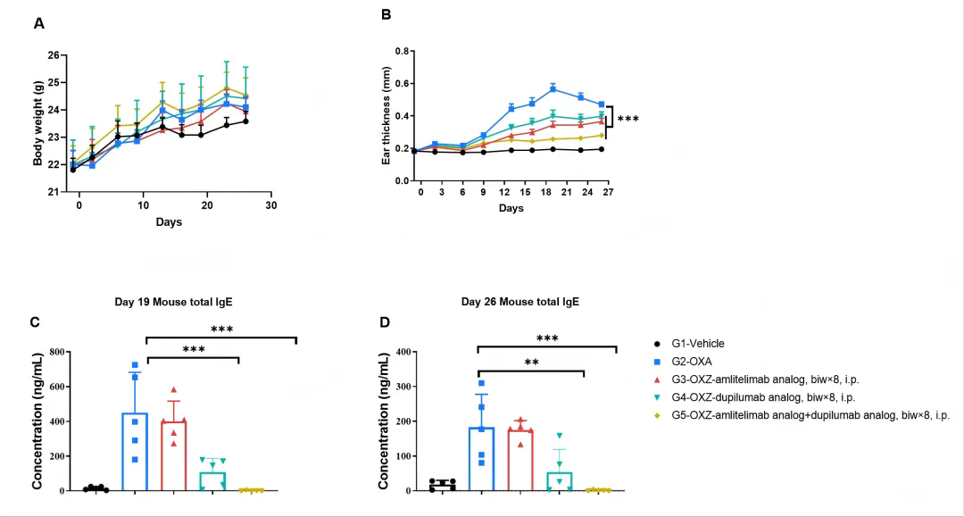 在B-hIL4/hIL4RA/hIL13/hIL13RA1/hOX40/hOX40L小鼠中抗人OX40L抗体Amlitelimab类似物与抗人IL4RA抗体Dupilumab类似物的药效。(A&B)治疗期间耳厚与体重变化。(C&D)血清总IgE水平。结果显示,与未处理组(G2)相比,接受Amlitelimab类似物或Dupilumab类似物治疗的小鼠耳厚显著降低,单抗联用效果优于单抗治疗药效。研究终点采集血清样本,通过ELISA法检测IgE水平。结果显示,接受Amlitelimab类似物联合Dupilumab类似物治疗的小鼠血清总IgE水平低于未治疗组,与耳厚结果保持一致,单抗联用优于单抗治疗。数据以均值±标准误表示。采用双因素方差分析检验显著性。 *P<0.05, **P<0.01, ***P<0.001。