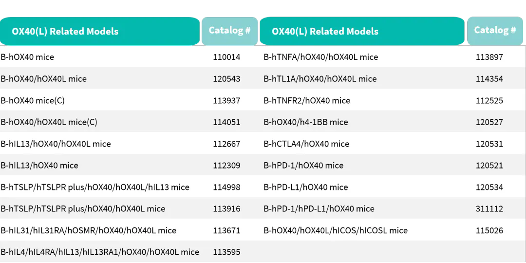 Biocytogen已公开提供与OX40/OX40L相关的人源化小鼠模型,包括B-hOX40/hOX40L mice,以及面向多靶点联用评估的相关组合模型。官方介绍显示,这些模型可用于评估抗体候选分子与免疫通路干预效果。