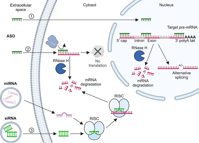 siRNA 通过 RNA 诱导沉默复合体(RISC)介导的靶向切割,实现高效而特异的基因沉默;ASO 则可在转录后调控、剪接干预乃至翻译层面发挥作用。[1.2]