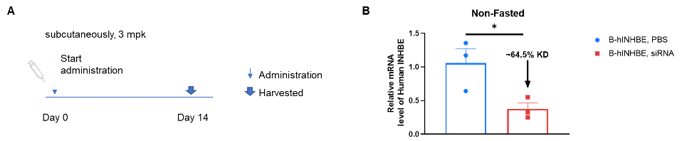 将B-hINHBE小鼠(雄性,7-8周龄)随机分为两组。分别给予靶向人源INHBE的核酸药物(根据专利合成)或PBS对照处理。给药后第14天处死小鼠,采集肝组织,采用qPCR检测人源INHBE mRNA的表达水平。(A) 实验流程示意图。(B) 通过qPCR检测人源INHBE mRNA的表达水平。与对照组相比,siRNA处理组中人源INHBE表达显著降低。