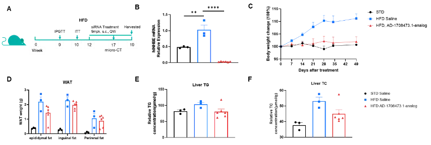 将B-hINHBE小鼠高脂饲养12周后根据体重分组,分别给予小鼠生理盐水和靶向人源INHBE的核酸药物(根据专利合成)。小鼠每周一次皮下给药,给药期间每周检测体重,。(A) 实验流程示意图。(B) 实验终点肝脏中INHBE的mRNA水平。(C) 治疗期间的体重变化。(D) 实验终点的白色脂肪质量变化。(E) 实验终点的肝脏甘油三酯变化。(F) 实验终点的肝脏总胆固醇变化。