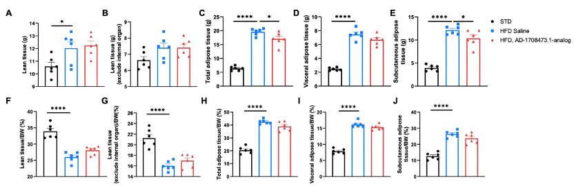 HFD诱导的B-hINHBE小鼠中INHBE-siRNA的药效研究。使用micro-CT 对小鼠进行3D重建分析在给药7次后对瘦体重和脂肪组织的变化。(A–E) 瘦组织重量、去除内脏后的瘦组织重量、总脂肪组织重量、内脏脂肪组织重量以及皮下脂肪组织重量。(F–J) 瘦组织占小鼠体重的百分比、去除内脏后的瘦组织占比、总脂肪组织占比、内脏脂肪组织占比以及皮下脂肪组织占比。