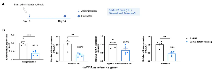 将B-hALK7小鼠(H/+,雄性,10周龄,n=5)随机分为两组。分别给予靶向人源ALK7的核酸药物(客户提供)或PBS对照处理。给药后第14天处死小鼠,收集脂肪组织,通过qPCR检测人源ALK7 mRNA的表达水平。(A) 实验处理示意图。(B) 脂肪组织中人源ALK7 mRNA的表达情况。