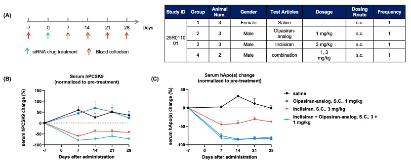 将 B-hLPA/hAPOB/hPCSK9 plus小鼠(6周龄)随机分为四组(每组n=2–3)。分别给予Olpasiran 类似物(由客户提供)、Inclisiran以及联合用药处理。给药后采集血清,检测Apo(a)和PCSK9的水平。(A) 实验流程示意图。(B)给药后人源PCSK9相对基线的平均变化百分比。(C) 给药后人源Apo(a)相对基线的平均变化百分比。数据以均值±SEM表示。