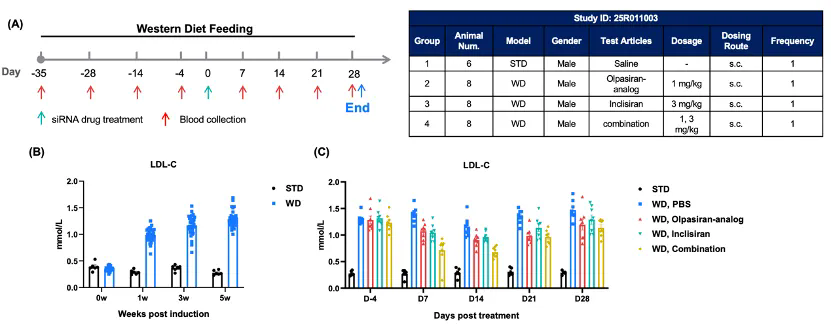 B-hLPA/hAPOB/hPCSK9 plus小鼠在实验开始时饲喂西方高脂饮食(Western Diet, XT079B,40%能量来自脂肪,胆固醇含量0.15%)5周,然后根据LDL-C水平将小鼠分为四组。分别给予Olpasiran类似物(根据专利合成),Inclisiran以及联合用药处理。(A) 实验流程示意图。(B) WD诱导后的LDL-C变化。(C) 给药后的LDL-C变化。数据以均值±SEM表示。
