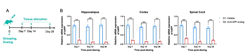 将B-hAPP*K670N*M671L*V717I小鼠(雄性,10周龄,n=4/组)随机分为两组。分别给予ALN-APP类似物(由客户提供)或人工脑脊液。小鼠在第7天、第14天和第28天被处死,收集海马体、皮层和脊髓组织,通过qRT-PCR检测人源APP mRNA的表达水平。(A) 实验流程示意图。(B) 海马体、皮层和脊髓中人源APP mRNA的表达情况。与对照组(G1)相比,处理组(G2)中人源APP mRNA显著降低,表明B-hAPP*K670N*M671L*V717I小鼠可作为评估人源APP靶向核酸药物体内药效的有效前临床模型。数据以均值±SEM表示。统计学分析采用非配对t检验,***P < 0.001。(本实验与客户合作)