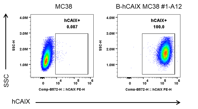 CAIX expression analysis in B-hCAIX MC38 cells by flow cytometry. Single cell suspensions from wild-type MC38 and B-hCAIX MC38 #1-A12 were stained with anti-human CAIX antibody (R&D, FAB2188P). Human CAIX were detected on the surface of B-hCAIX MC38 cells but not wild-type MC38 cells.