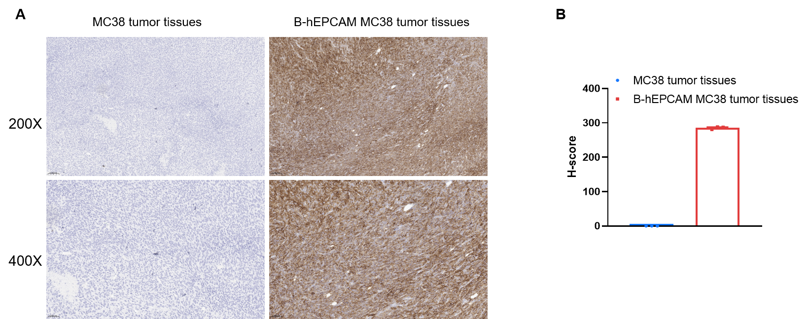 Immunohistochemical (IHC) analysis of EPCAM expression in B-hEPCAM MC38 tumor tissues. B-hEPCAM MC38 cells were subcutaneously transplanted into B-hCD3EDG/hEPCAM mice (female, 9-week-old, n=6), and on 28 days post inoculation, tumor tissues were harvested and assessed for human EPCAM expression via IHC using an anti-human EPCAM antibody (abcam, ab223582). (A) Representative histology and (B) H-score from image analysis of immunohistochemical staining for human EPCAM in MC38 tumor tissues and B-hEPCAM MC38 tumor tissues. Human EPCAM showed high expression in B-hEPCAM MC38 tumor tissues.