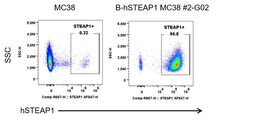 The mouse Steap1 gene was replaced by human STEAP1 coding sequence in B-hSTEAP1 MC38 cells. Human STEAP1 is highly expressed on the surface of B-hSTEAP1 MC38 cells.