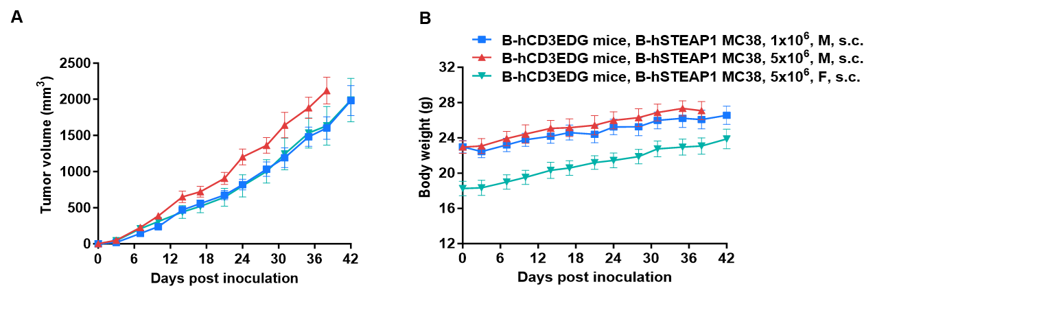 Subcutaneous homograft tumor growth of B-hSTEAP1 MC38 cells. B-hSTEAP1 MC38 cells (1x106, 5x106) were subcutaneously implanted into B-hCD3EDG mice (male and female, 7-8-week-old, n=5). Tumor volume and body weight were measured twice a week. (A) Average tumor volume ± SEM. (B) Body weight (Mean± SEM). Volume was expressed in mm3 using the formula: V=0.5 X long diameter X short diameter2. As shown in panel A, B-hSTEAP1 MC38 cells were able to establish tumors in vivo and can be used for efficacy studies.