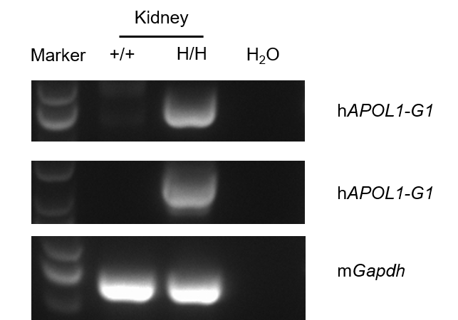 Strain specific analysis of APOL1-G1 mRNA expression in wild-type C57BL/6JNifdc and B-hAPOL1-G1 mice by RT-PCR. Kidney RNA were isolated from wild-type C57BL/6JNifdc (+/+) and homozygous B-hAPOL1-G1 mice (H/H), then cDNA libraries were synthesized by reverse transcription, followed by PCR with human APOL1-G1 primers. Human APOL1-G1 mRNA was exclusively detectable in homozygous B-hAPOL1-G1 mice.