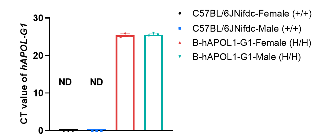 • Validation: Human APOL1-G1 mRNA was exclusively detectable in homozygous B-hAPOL1-G1 mice. Human APOL1 protein was exclusively detectable in homozygous B-hAPOL1-G1 mice but not in wild-type C57BL/6JNifdc mice.