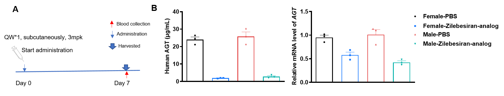 The inhibitory efficiency of the AGT-targeted nucleic acid drugs in homozygous B-hAGT/hREN mice. B-hAGT/hREN mice were randomly divided into four groups (6-8 weeks old, female and male). The human AGT targeted nucleic acid drugs (Zilebesiran-analog) and PBS were administered to the mice individually. Zilebesiran-analog was administered in the form of PBS aqueous solution. The mice were sacrificed on day 7, and the liver tissue was collected to detect the expression level of human AGT protein by ELISA and human AGT mRNA by qPCR. (A) The schematic diagram of experimental processing. (B) The expression of human AGT protein and human AGT mRNA in the liver after treatment. The human AGT in the treatment group was reduced compared to the control group, demonstrating that B-hAGT/hREN mice provide a powerful preclinical model for in vivo evaluation of human AGT-targeted nucleic acid drugs. Values are expressed as mean ± SEM.