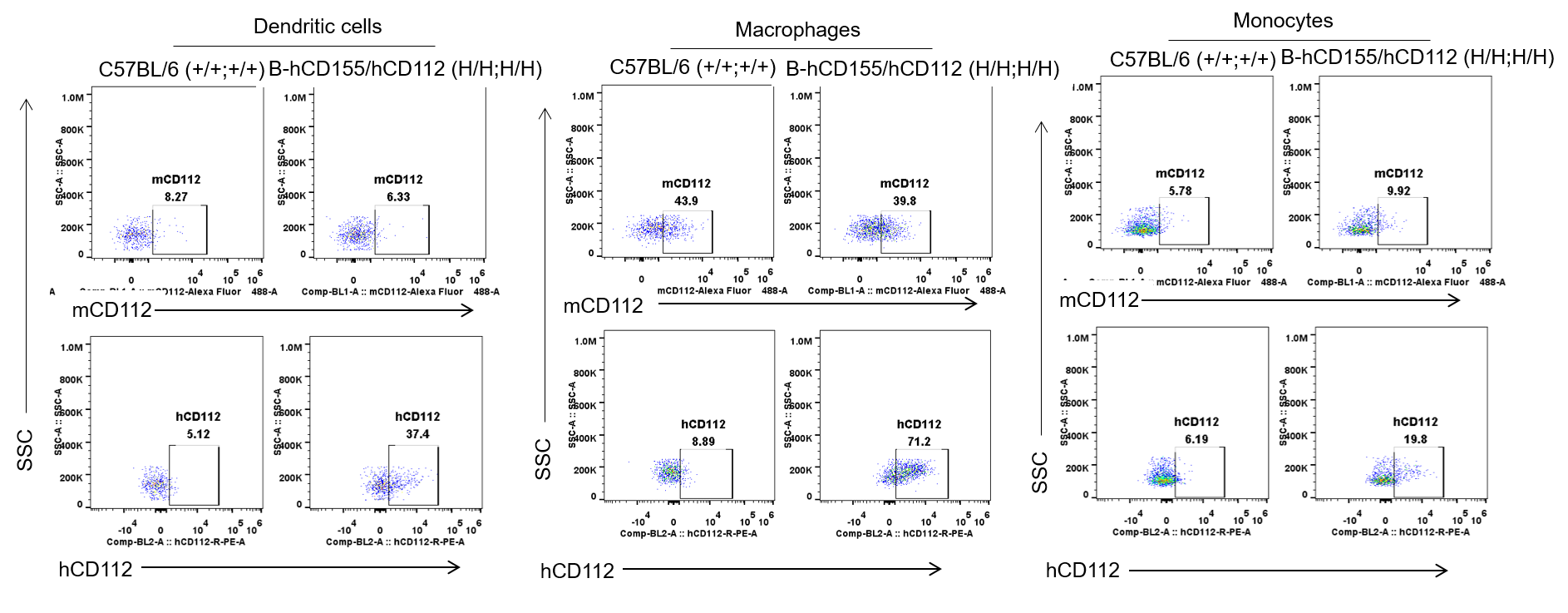 Strain specific CD112 expression analysis in homozygous B-hCD155/hCD112 mice by flow cytometry. Dendritic cells, macrophages and monocytes of spleen were collected from wild-type C57BL/6 mice (+/+;+/+) and homozygous B-hCD155/hCD112 mice (H/H;H/H), and analyzed by flow cytometry with anti-CD112 antibodies. Mouse CD112 was detectable in wild-type mice. Human CD112 was exclusively detectable in homozygous B-hCD155/hCD112 mice but not in wild-type mice. Anti-mCD112 antibody is a human-mouse cross-binding antibody.