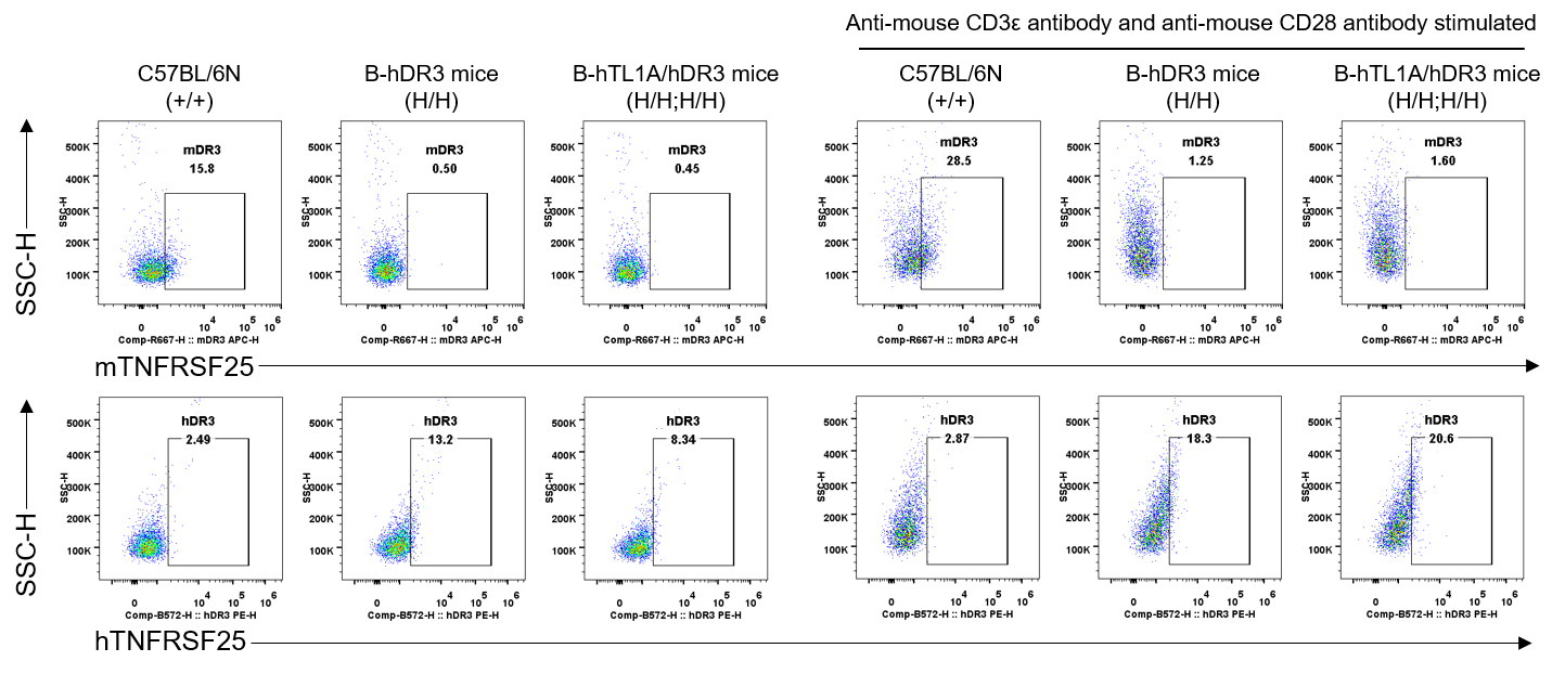 Strain specific DR3 expression analysis in wild-type C57BL/6N mice and homozygous B-hDR3 mice by flow cytometry. Splenocytes were collected from wild-type C57BL/6N mice(+/+) and homozygous B-hDR3 mice(H/H), protein expression was analyzed with anti-mouse DR3 antibody (Biolegend, 144407) and anti-human DR3 antibody (Biolegend, 307105) by flow cytometry. Mouse DR3 was detectable in wild-type C57BL/6N mice, human DR3 was detectable in homozygous B-hDR3 mice.