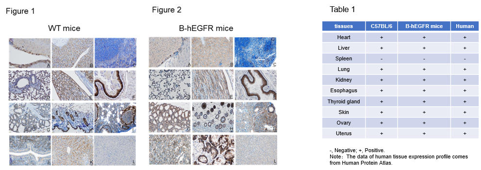 Immunohistochemical (IHC) analysis of EGFR protein expression in wild-type (WT) mice and B-hEGFR mice. Ten major tissues were collected from WT mice and homozygous B-hEGFR mice (2 females, 8 weeks-old), and analyzed by IHC with anti-EGFR antibodies. Humanized EGFR was detected in the heart (A), liver (B), lung (D), kidney (E), esophagus (F), thyroid (G), skin (H), ovary (I) and uterus (J) of homozygous B-hEGFR mice (Figure 2) and human EGFR positive control (K), but not in spleen (C) and human EGFR negative control (L). This is similar to the mouse EGFR expression profile of WT mice (Figure 1, Table 1). The results showed that humanized EGFR did not change the expression site of EGFR protein in B-hEGFR mice, and the expression profile of EGFR in B-hEGFR mice was similar to that in normal human tissues (Table 1).