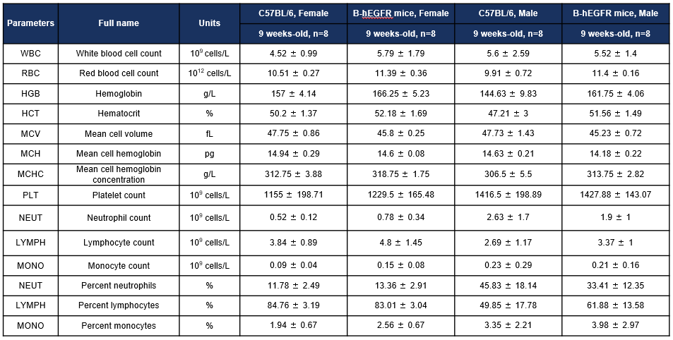 Complete blood count (CBC) of B-hEGFR mice. Values are expressed as mean ± SD.