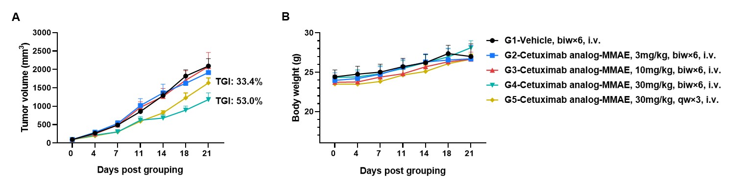 Antitumor activity of anti-human EGFR antibody in B-hEGFR mice. (A) Anti-human EGFR antibody inhibited B-Tg(hEGFR) MC38 tumor growth in homozygous B-hEGFR mice. Murine colon cancer B-Tg(hEGFR) MC38 cells were subcutaneously implanted into homozygous B-hEGFR mice (female, 6-8 weeks-old, n=6). Mice were grouped when tumor volume reached approximately 50-150 mm3, at which time they were intravenous injected with anti-human EGFR ADC cetuximab analog-MMAE (in house) indicated in panel. (B) Body weight changes during treatment. As shown in panel A, 30mg/kg anti-human EGFR ADC cetuximab analog-MMAE (in house) treatment group was efficacious in controlling tumor growth in B-hEGFR mice, demonstrating that the B-Tg(hEGFR) MC38 provide a powerful preclinical model for in vivo evaluation of anti-human EGFR antibodies. Values are expressed as mean ± SEM.