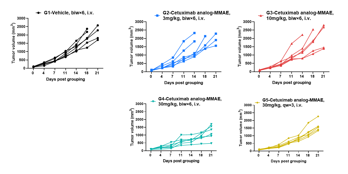 Antitumor activity of anti-human EGFR antibody in B-hEGFR mice. Anti-human EGFR antibody inhibited B-Tg(hEGFR) MC38 tumor growth in homozygous B-hEGFR mice. Murine colon cancer B-Tg(hEGFR) MC38 cells were subcutaneously implanted into homozygous B-hEGFR mice (female, 6-8 weeks-old, n=6). Mice were grouped when tumor volume reached approximately 50-150 mm3, at which time they were intravenous injected with anti-human EGFR ADC cetuximab analog-MMAE (in house) indicated in panel.