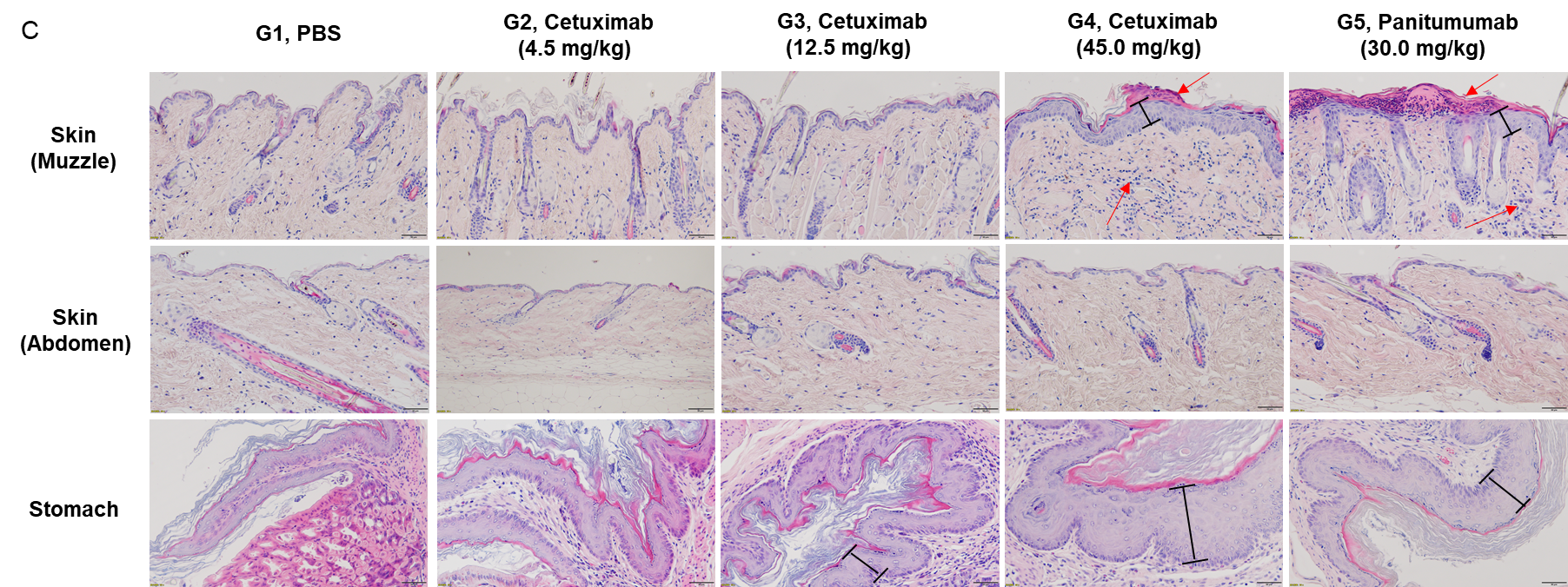 (C) Pathological diagrams of various tissues. The histopathological examination in muzzle skin revealed article-related alteration in cetuximab biosimilar 45 mg/kg dose group (1/6, minimal), which showed squamous epithelial cells proliferation and subcutaneous infiltration of inflammatory cells. The similar article-related changes were also found in panitumumab group (5/6, minimal). Squamous epithelial cells proliferation in stomach limiting ridge were observed in mice administrated cetuximab biosimilar at the dose of 12.5 mg/kg (4/6, minimal) and 45 mg/kg groups (2/6, minimal; 4/6, slight), which were considered test-article and dose related. The similar article-related changes were also found in panitumumab group (3/6, minimal; 3/6, slight). Neither cetuximab biosimilar nor panitumumab showed any toxicity in the abdominal skin, duodenum, jejunum, ileum, cecum, colon, and rectum of mice (The data is not shown).