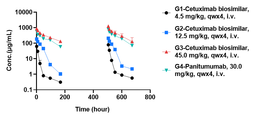Anti-human EGFR antibody cetuximab biosimilar (Bio X Cell, 907623J2) or panitumumab (Takeda, 549661) were intravenously injected into B-hEGFR mice (male, 14-15 weeks-old, n=2). Blood samples were collected at 1h, 8h, 24h, 48h, 96h, and 168h after the first and fourth doses, and then the drug concentrations in the blood were measured. As shown in the figure, with the increase of dosage, the blood concentration of cetuximab biosimilar also increases. This indicates that the relationship between the blood concentration of cetuximab biosimilar and dosage is linear within the experimental dosage range. The existence of this linear relationship may be due to the absence of saturation during the absorption, distribution, metabolism, and excretion of drugs in mice.