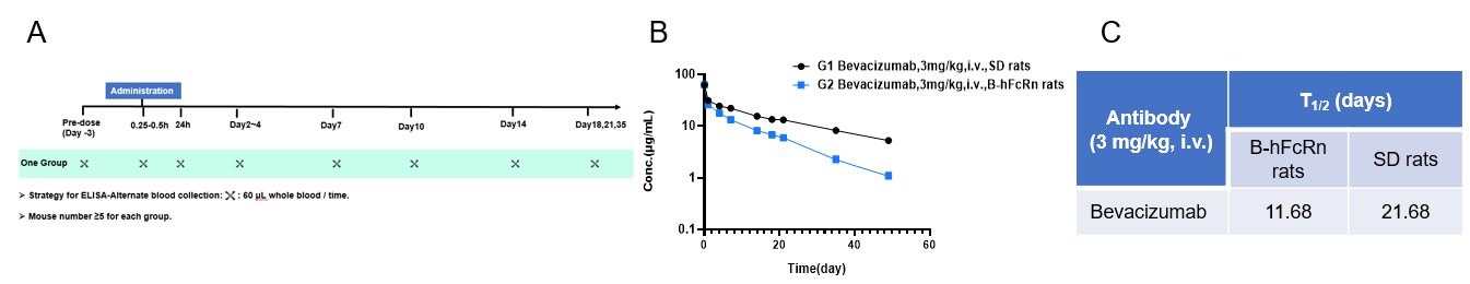 SD rats and B-hFcRn rats were intravenously injected with Bevacizumab (commercial), and serum was collected for pharmacokinetic (PK) analysis (n=6). A, Design of Blood Collection Timepoints. B, The PK curve. C, The PK parameters. Data are shown as mean ± SEM.