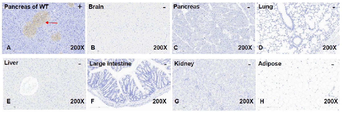 Mouse GLP1R protein expression was assessed in GIPR/GLP1R humanized mice (B-hGIPR/hGLP1R) by immunohistochemistry (IHC). Tissue sections were stained with a mouse-specific anti-GLP1R antibody (Abcam, ab218532). Mouse GLP1R protein was detected in the pancreas of wild-type C57BL/6JNifdc mice. In contrast, brain, pancreas, lung, liver, large intestine, kidney, and adipose tissue from homozygous GIPR/GLP1R humanized mice all showed negative staining for mouse GLP1R, confirming effective disruption of the endogenous mouse gene. (Original magnification: ×200)