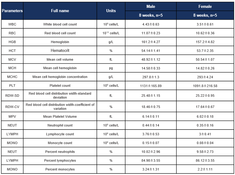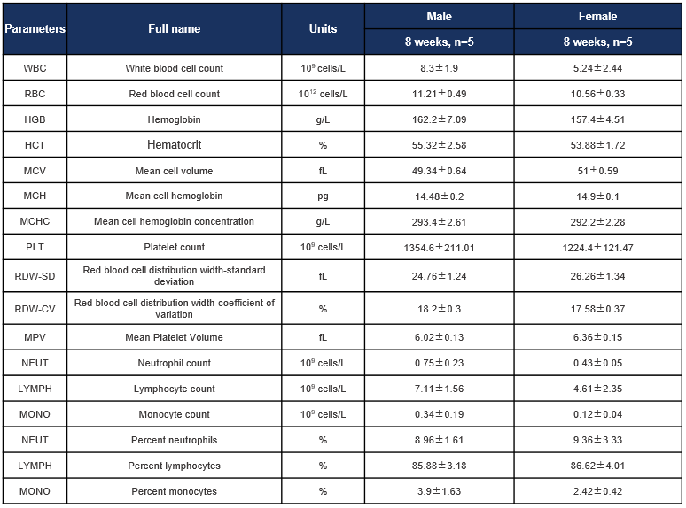 Complete blood count (CBC) of C57BL/6JNifdc mice. Values are expressed as mean ± SD.