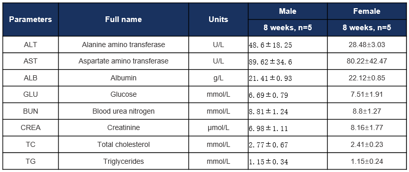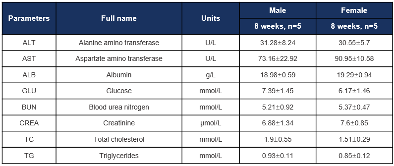 Biochemical test of C57BL/6JNifdc mice. Values are expressed as mean ± SD.