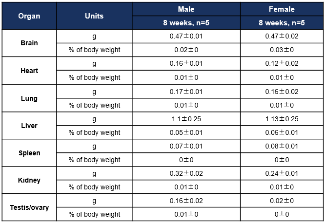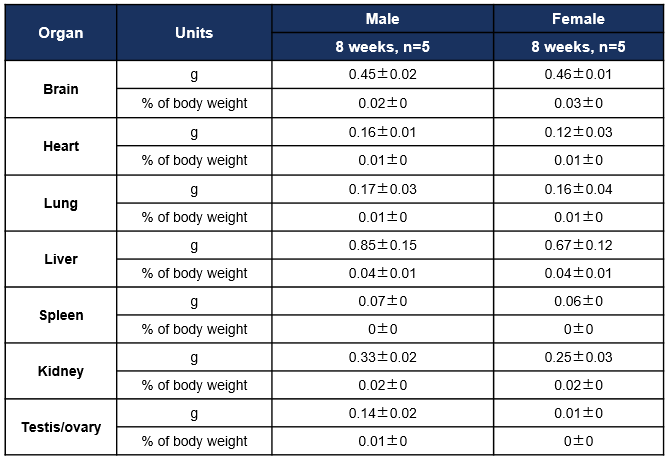Average weight of the main organs of C57BL/6JNifdc mice. Values are expressed as mean ± SD.