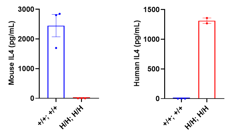 Strain specific IL4 expression analysis in homozygous B-hIL4/hIL4RA mice(C) by ELISA. Serum was collected from wild-type BALB/c mice (+/+; +/+) and homozygous B-hIL4/hIL4RA mice(C) (H/H; H/H) stimulated with anti-CD3ε in vivo, and analyzed by ELISA with species-specific IL4 ELISA kit. Mouse IL4 was detectable in wild-type BALB/c mice. Human IL4 was exclusively detectable in homozygous B-hIL4/hIL4RA mice(C) but not in wild-type BALB/c mice.