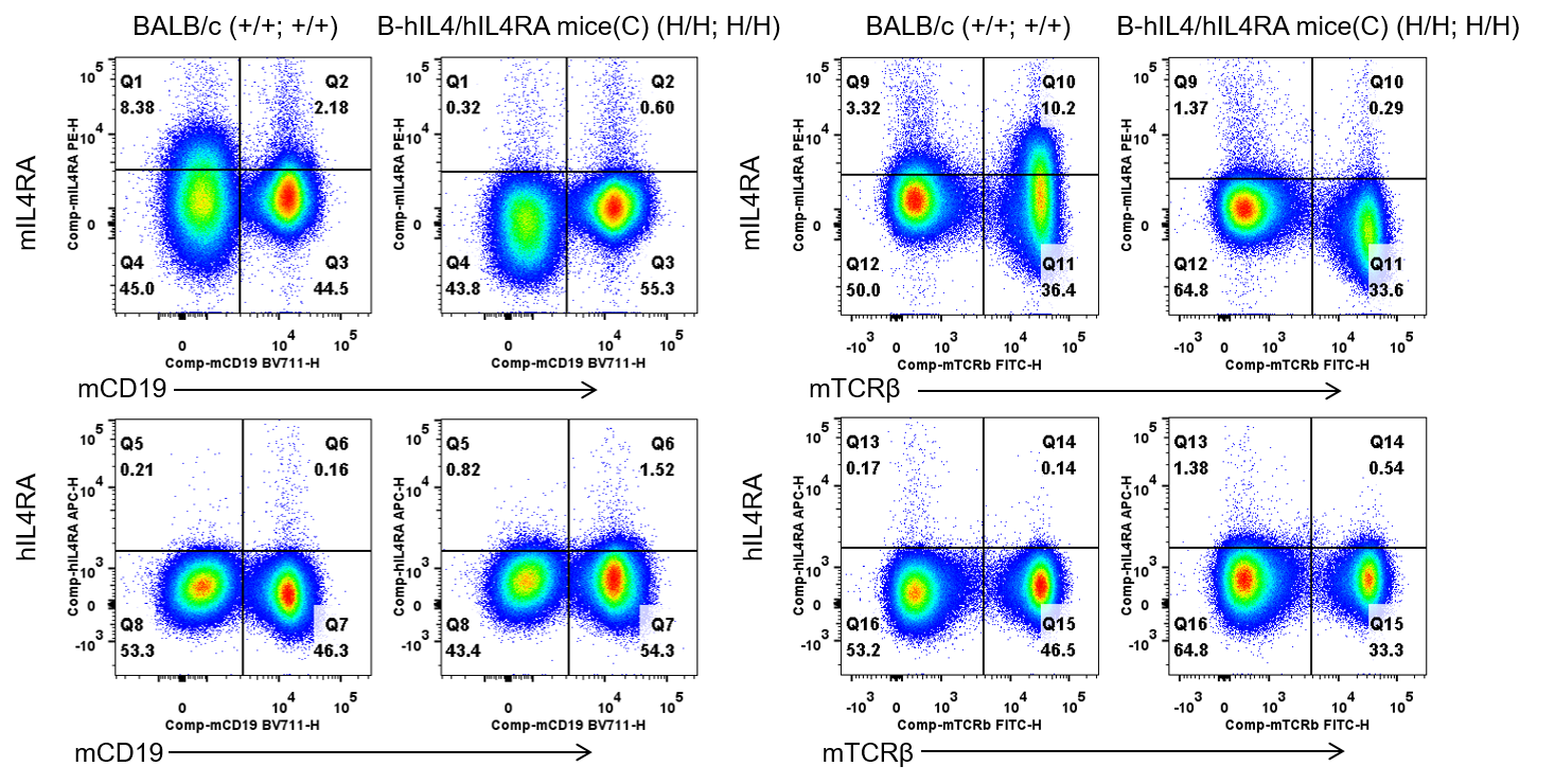 Strain specific IL4RA expression analysis in homozygous B-hIL4/hIL4RA mice(C) by flow cytometry. Splenocytes were collected from wild-type BALB/c mice (+/+; +/+) and homozygous B-hIL4/hIL4RA mice(C) (H/H; H/H), and analyzed by flow cytometry with species-specific anti-IL4RA antibody. Mouse IL4RA was detectable in wild-type BALB/c mice. Human IL4RA was exclusively detectable in homozygous B-hIL4/hIL4RA mice(C) but not in wild-type BALB/c mice.