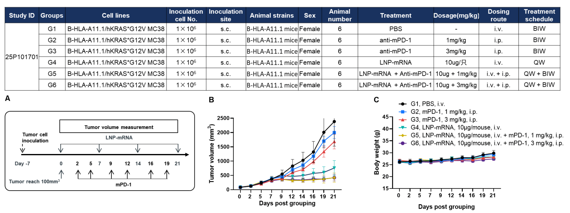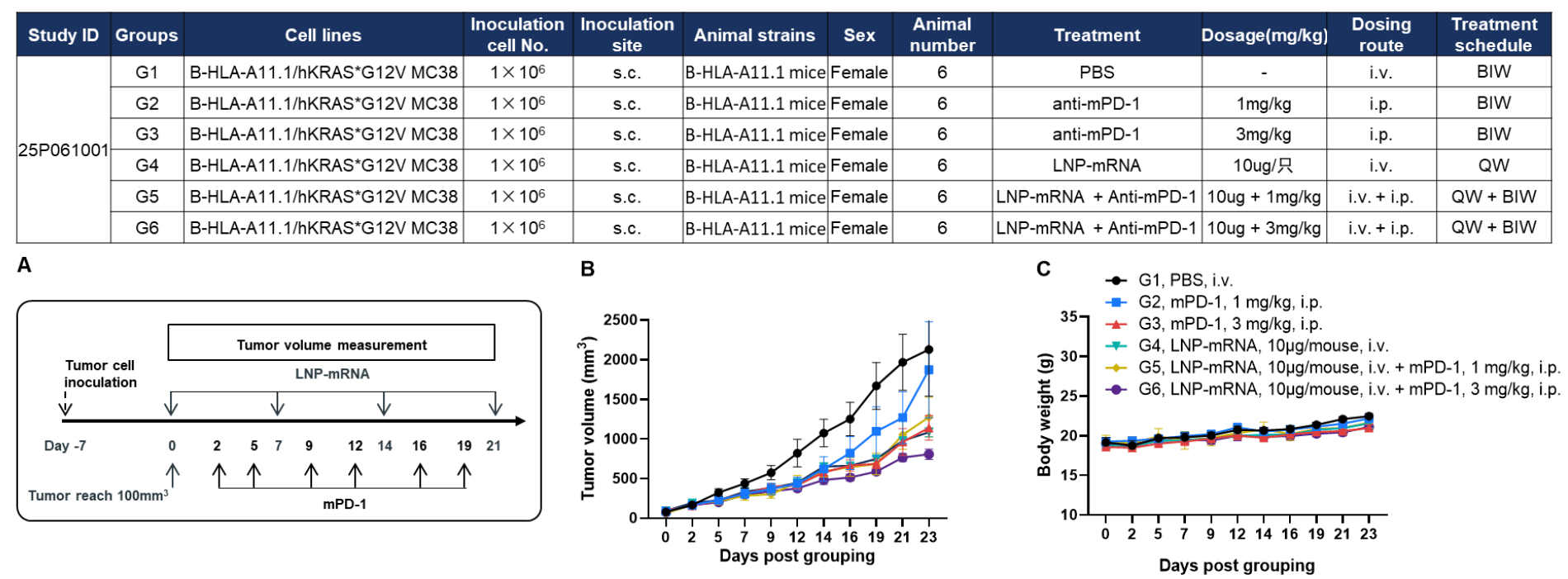 Antitumor activity of anti–mouse PD-1 antibody combined with KRAS*G12V mRNA vaccine in HLA-A11.1 humanized mice (B-HLA-A11.1). HLA-A11.1 humanized mice (B-HLA-A11.1) were subcutaneously implanted with 1 × 10⁶ B-HLA-A11.1/hKRAS*G12V MC38 tumor cells in the right flank and grouped when tumor volume reached approximately 100 mm³, at which time mice were treated with anti–mouse PD-1 antibody or therapeutic mRNA vaccine according to the doses and schedules indicated. (A) Experimental scheme illustrating tumor cell inoculation, LNP-mRNA administration, tumor volume measurement, and anti–mouse PD-1 antibody treatment. (B) Tumor growth curves showing that the combination of anti–mouse PD-1 antibody and mRNA vaccine exhibited greater inhibitory effects on tumor growth compared with individual treatment groups. (C) Body weight changes during tumor growth observation. These results demonstrate that HLA-A11.1 humanized mice (B-HLA-A11.1) provide a powerful preclinical model for in vivo evaluation of combination therapy efficacy of mPD-1 antibodies and mRNA vaccines. Values are expressed as mean ± SEM.