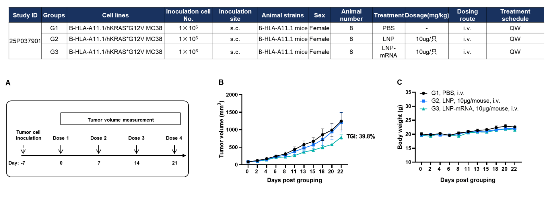 Antitumor activity of KRAS*G12V mRNA vaccine in HLA-A11.1 humanized mice (B-HLA-A11.1). HLA-A11.1 humanized mice (B-HLA-A11.1) were subcutaneously implanted with 1 × 10⁶ B-HLA-A11.1/hKRAS*G12V MC38 tumor cells in the right flank and grouped when tumor volume reached approximately 100 mm³. Mice were then immunized with PBS, LNP, or LNP-formulated mRNA vaccine according to the dosing schedule indicated. (A) Experimental scheme illustrating tumor cell inoculation, mRNA vaccination schedule, and tumor volume measurement. (B) Tumor growth curves showing that therapeutic treatment with the KRAS*G12V mRNA vaccine inhibited tumor growth compared with control groups. (C) Body weight changes during tumor growth observation. These results demonstrate that HLA-A11.1 humanized mice (B-HLA-A11.1) provide a robust preclinical model for in vivo evaluation of mRNA vaccines. Values are expressed as mean ± SEM.